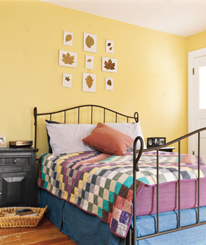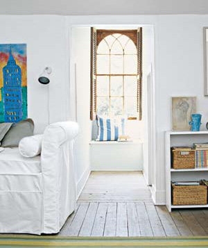 Những chiếc gối trắng lớn sẽ che đi những mảng tối trên đầu giường, chiếc tủ nằm được bỏ ra, còn chiếc tủ đứng được khoác một chiếc áo mới bằng cách sơn lên bề mặt của chiếc tủ một lớp sơn màu trắng, giúp nó phù hợp hơn với căn phòng. Điều này mở ra một không gian tường lớn hơn, cung cấp nhiều diện tích hơn để bạn có thể treo các tấm ảnh, bức tranh hay các hình thức trang trí khác.
