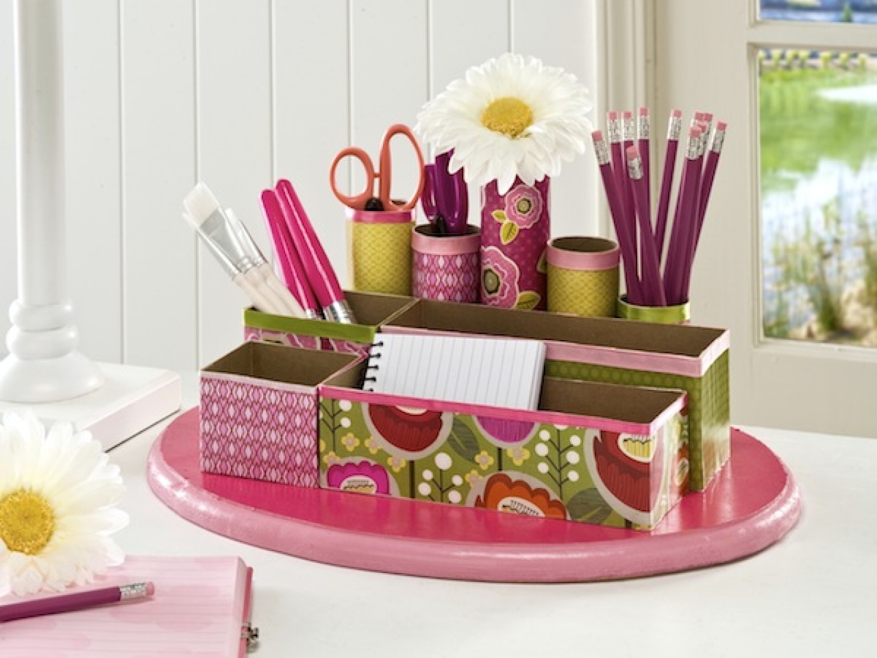 10. Tận dụng lại những chiếc lõi giấy vệ sinh và những bìa các tông cũ, bạn có thể có một khay đựng bút, thước, dập ghim, kéo…cho góc làm việc ngăn nắp, gọn gàng.