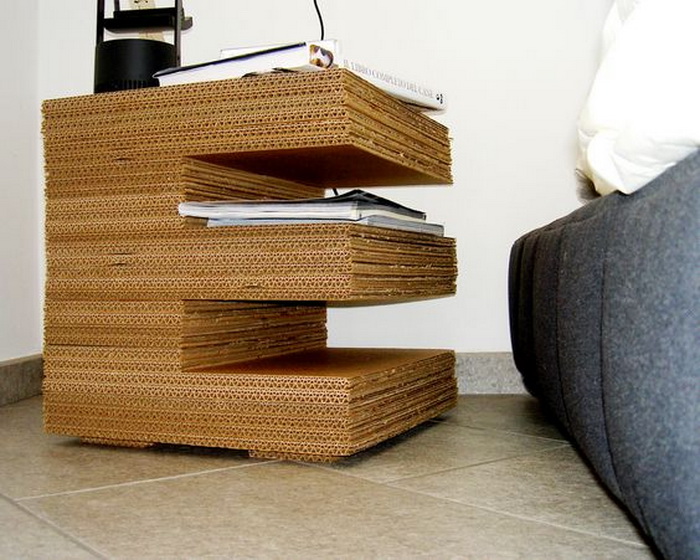 3. Cắt những bìa các tông cùng kiểu và cùng kích thước, sau đó dán lần lượt các lớp lên nhau, bạn sẽ có một chiếc kệ vô cùng chắc chắn để đặt ở đầu giường, ví dụ như để đựng sách, đèn ngủ…