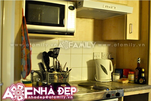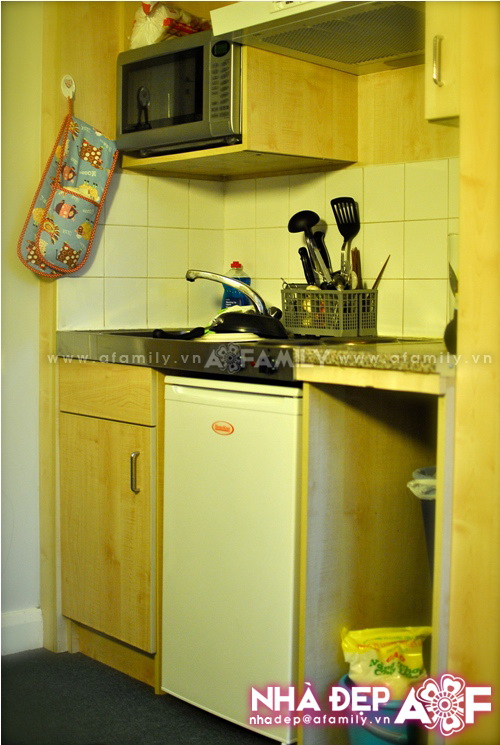 Một góc bếp nhỏ nhưng lại khá đầy đủ tiện nghi và rất gọn gàng. Hồng Nguyên chia sẻ: “Sống xa quê hương nên mình rất nhớ món ăn ở Việt Nam. Mình thường xuyên nấu những món đặc sản của riêng mình. Tuy ở đây thiếu một vài hương liệu để chế biến nhưng cũng cảm thấy hạnh phúc khi nhờ nó mà mình sẽ ít nhiều vơi đi nỗi nhớ…”.