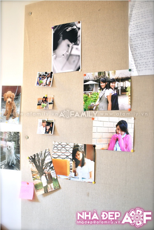 Bức tường là nơi cô bạn xinh xắn dùng một góc để lưu giữ những hình ảnh thân thương nơi quê nhà. Đó là những tấm ảnh Hồng Nguyên chụp chung với gia đình, bạn bè thân thiết. Có cả 2 chú cún con nhà Nguyên trông rất ngộ nghĩnh nữa.
