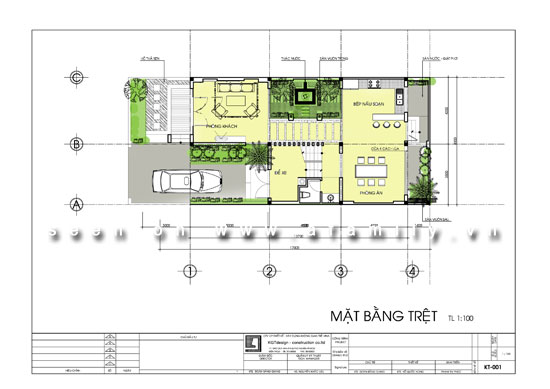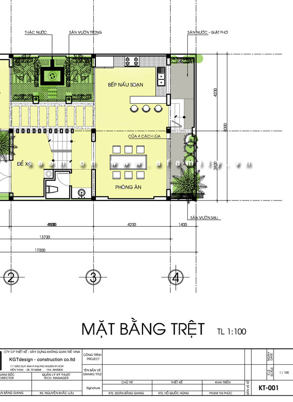- Tầng trệt: Phía trước là phòng khách, kết hợp với tủ thờ kệ ti vi. Vị trí giếng trời - sân trong là không gian kết nối giữa phòng khách và phòng ăn.
